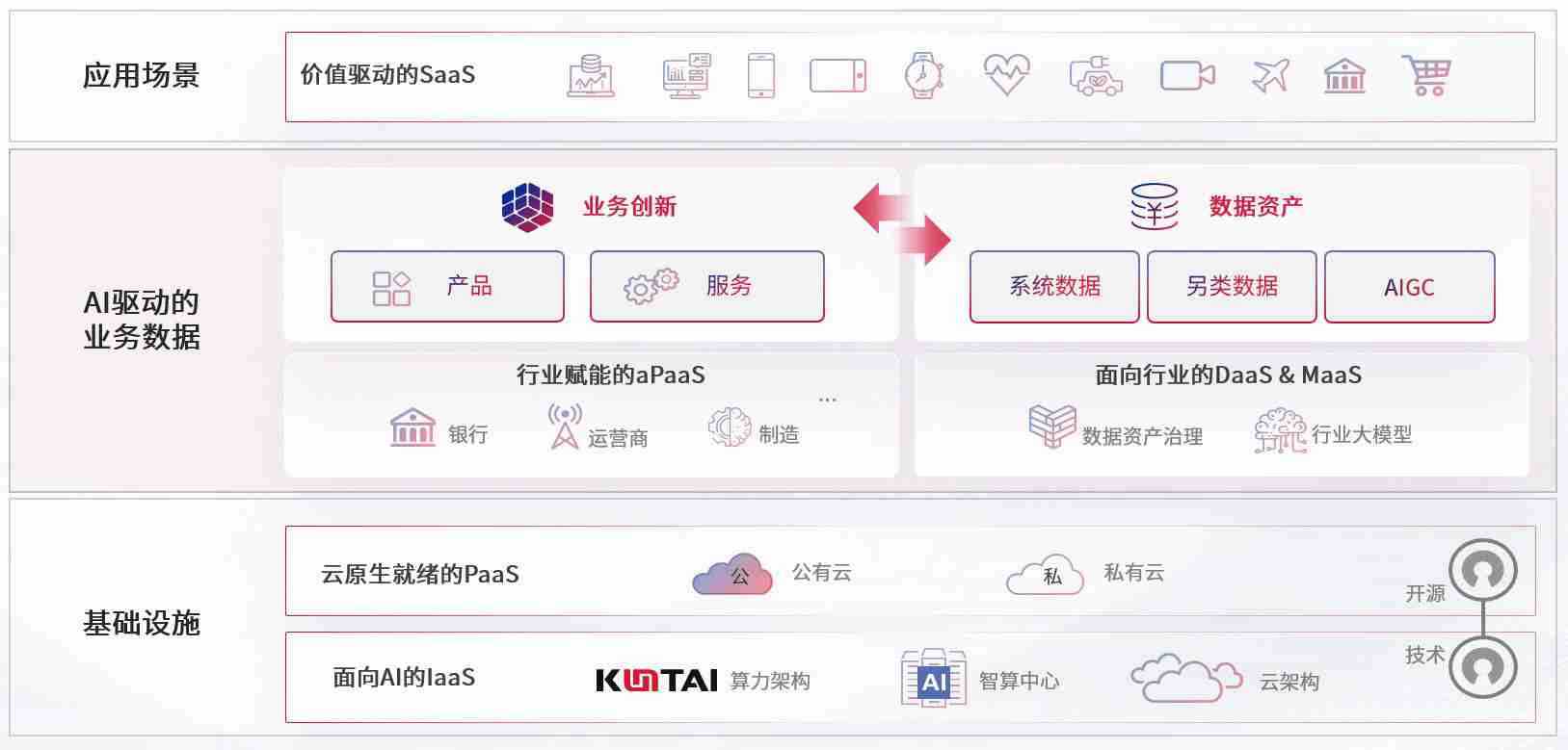 数字时代,,,,围绕企业数字化转型的关键要素,,GGPOKER数码开创性的提出数云融合战略和技术体系框架,,,着力在云原生、、、、数字原生、、、、AI原生和信创产业上架构产品和服务能力,,,为处在不同数字化转型阶段的快消零售、、、、汽车、、、金融、、医疗、、、政企、、、教育、、、、运营商等行业客户提供泛在的敏捷IT能力和融合的数据驱动能力,,构建跨界融合创新的数字业务场景和新业务模式,,,助力企业级客户建立面向未来的核心能力和竞争优势,,全面推动社会的数字化、、、智能化转型升级。。。